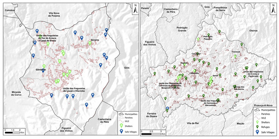 However, both municipalities have identified in their respective Municipal Civil Protection Emergency Plans (PMEPC) places that can accommodate people in the event of an evacuation. In the case of Sertã, the document dates from 2012 [43] and identifies 66 sites, classified into two types: temporary shelters and local concentration zones. Temporary shelters are only referenced for primary evacuations, i.e., the removal of the inhabitants from risk areas to a place of safety, followed by the second phase of evacuation, i.e., travelling to shelter facilities, where all basic needs can be met. In the case of Lousã, the PMEPC [44] identifies 12 sites. Although no typology is specified, all the sites are large and capable of sheltering a significant number of people. The final selection of these sites basically involves schools, day centres, parish councils, pavilions, and sports centres, i.e., fixed structures that are well known to the population.