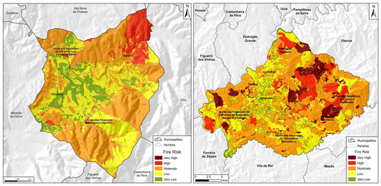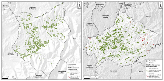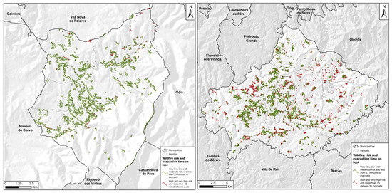 The fire risk maps show quite different results from the previous ones. In the case of the municipality of Lousã, its population centre, previously classified as very vulnerable, is now classified as “Very Low”, “Low”, and “Moderate” in terms of fire risk for evacuation support (Figure 7).
