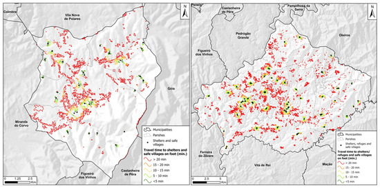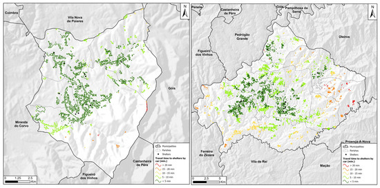 Two exercises were carried out for both municipalities under study, namely determining the time it takes to walk to identified shelters and refuges, and determining the time it takes to drive to larger shelters. As both municipalities have high rates of an ageing population (22.9% in Lousã and 31.1% in Sertã), we adopted the figures obtained by Rodrigues et al. [47] in real evacuation tests on foot in Cabanões, a village in the municipality of Lousã. Rodrigues et al. [47] identified the following average speeds: for individuals over 65 without mobility difficulties, 3.13 km/h uphill and 3.65 km/h downhill; for individuals over 65 with mobility difficulties, 2.24 km/h uphill and 2.47 km/h downhill; and for group evacuation, 2.5 km/h. The average speed in a group falls thanks to the support and mutual help given to people with difficulties. We therefore opted for the group average speed, i.e., 2.5 km/h. The travelling time was assessed using the Network Analysis extension, with the Service Area tool in the ArcGis Pro 3.0 software [48].
