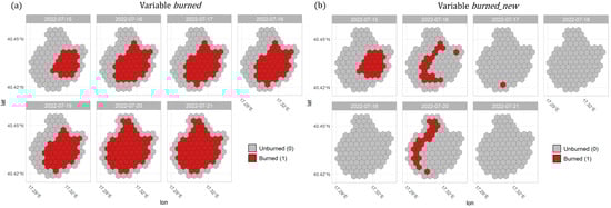Burned area variables within the H3 grid for an example wildfire AOI. (a) Time series of the total burned area (variable “burned”). (b) Time series of the daily new burned cells displaying the wildfire propagation (variable “burned_new”).