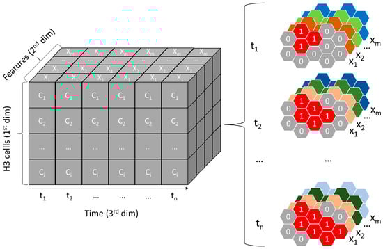 Datacube representation of a wildfire time series containing all H3 cells (c) (1st dimension), with all static and dynamic features (X) (2nd dimension) over the time steps (t) (3rd dimension). The datacube can also be represented as an ordered sequence of two-dimensional H3 grids over time.