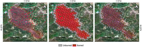 Different data representations of the burned area of a wildfire in Portugal. Background: Sentinel-2 RGB image from the 07.08.2020. (a) Burned area perimeter derived by the Sentinel-3 mapping algorithm. (b) Burned area perimeter displayed in H3 cells (resolution 9). (c) Burned area perimeter displayed as a graph.