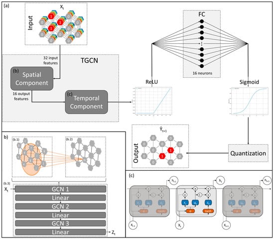 At first, the TGCN receives a graph structure at the time step Xt as input and passes it to the spatial modeling component (see Figure 4b). This consists of an implementation of the GCN by Kipf and Welling [59] which uses a spectral filter in the Fourier domain on the graph’s nodes to capture spatial features between all nodes in the first-order neighborhood (Figure 4(b.1,b.2)). In the TGCN, a stack of three subsequent GCN layers is used to increase the spatial component’s receptive field up to the third-order neighborhood nodes [58] (see Figure 4(b.3)). This results in a new feature-embedding matrix containing transformed feature vectors for each node.