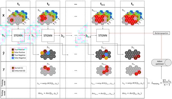 Figure 5 displays the model training workflow schematically. The models perform a binary node classification to predict the newly burned cells for each future day. The dependent targets are the newly burned cells (“burned_new”) of the day , which are predicted using the independent features of the current day . For every epoch, the model iterates over the temporal dimension of a training wildfire time series, receiving the input of the first day and an empty hidden state . Based on the input features of the first day , the STGNN cell then produces a prediction for the next day, labeling all cells that will be affected by the wildfire’s propagation. Furthermore, an updated hidden state is passed onto the next STGNN cell, preserving the temporal information from previous time steps. The daily weighted loss is calculated using the prediction and the reference of the respective day .The mean batch loss is computed after all iterations and used to update the model’s weights.