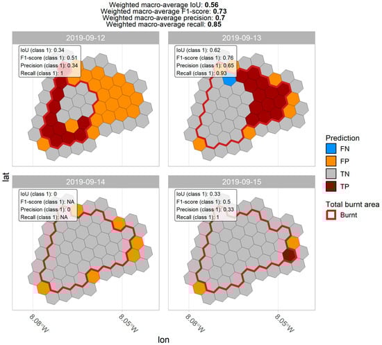 Figure 6 exemplifies the prediction results of the Portugal model for an individual wildfire time series. For this wildfire, the Portugal model achieved an above-average weighted macro-mean IoU (Level-2) of 0.57. Although significant overpredictions in the first two days are visible, the model was able to capture the general behavior of the fire and predicted the rapid increase in the burned area at the start of the time series.