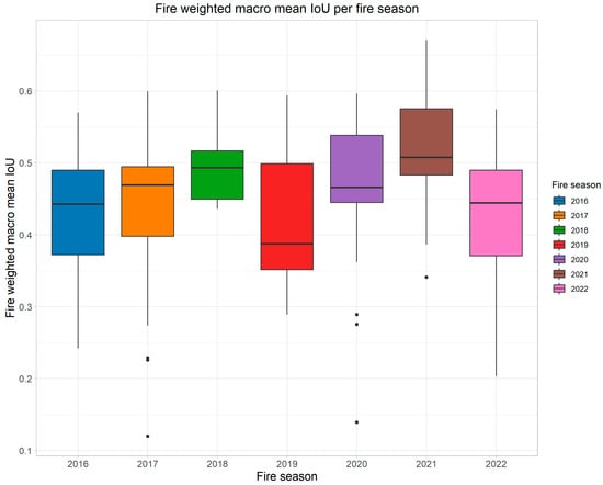 Comparing different fire seasons in Portugal, the model achieved similar median fire-weighted macro-mean accuracies (Level-2) over all fire seasons, ranging from 0.39 to 0.51 (see Figure 7). The fire seasons 2016, 2019, and 2022 showed the lowest accuracies with median fire-weighted macro-mean IoU values below 0.45. The best and most robust results were achieved with wildfires from the 2018 and 2021 fire seasons with median IoU values of 0.49 and 0.51, respectively.