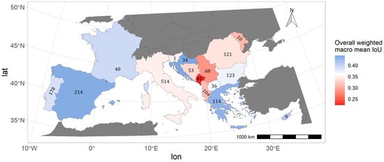 Overall performance of the Mediterranean model per country. The number in each country refers to the respective number of wildfires in the Mediterranean reference dataset.