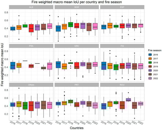 Like the Portugal model, the Mediterranean model achieved similar performances for all fire seasons for each country (see Figure 9). No particular fire season showed a significant increase or decrease in the model’s performance. Most wildfires in the fire-prone countries of Spain, France, Greece, Italy, and Portugal could be predicted with an overall weighted macro-mean IoU (Level-3) between 0.4 and 0.6 independent of the fire season.