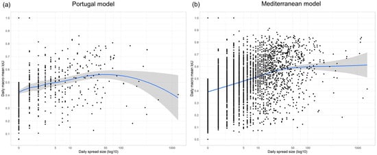 Model performance per daily wildfire spread size (number of new burned H3 cells). Each predicted wildfire is represented as a point. The blue line represents the trend line with the 95% confidence level interval (grey). (a) Portugal model. (b) Mediterranean model.