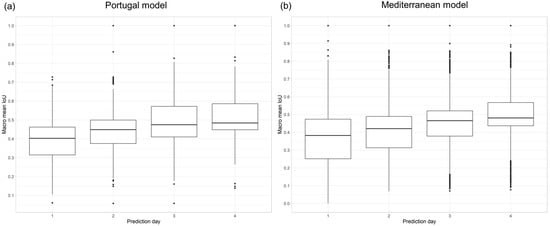 Results of the Mediterranean model also showed no significant performance differences comparing different wildfire seasons of Mediterranean countries (see Figure 9) despite large differences in their fire activity and fire sizes (see Figures S9 and S10). A qualitative comparison of different environmental conditions between Mediterranean countries also showed no clear model performance trends. The Mediterranean model performed best in Spain, Greece, and Portugal with overall weighted macro-mean IoU values of 0.44, 0.43 and 0.39, respectively. The similar performance in Spain and Portugal might result from the resemblance in the forest structure and dominant species in central and northern Portugal and the northwestern and northern parts of Spain, where large, homogenous stands of Eucalyptus globulus and other pine species are found [66,67]. However, Greece shows large differences to the environmental characteristics of Portugal or Spain, experiencing much hotter and drier summers while being covered predominantly by sparsely populated forest stands with mixed-in shrubland vegetation [9]. The fact that the model performed similarly well in Greece highlights the promising potential of data-driven methods to overcome the current transferability issues of wildfire spread models by exploiting the generalization abilities of spatiotemporal DL architectures.