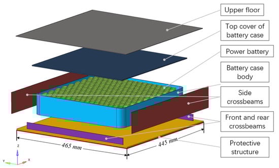 The Tesla Model S battery system structure was used as a model reference []. The power battery case system of an electric vehicle can be divided into six parts from top to bottom: the passenger floor, the top cover of the battery case, the battery pack, the battery case body, the crossbeam, and the protective structure, as shown in Figure 1. Among them, the passenger floor and the bottom protective structure have the same size, with a thickness of 1.5 mm; the left and right crossbeams have a size of 445 mm × 75 mm × 1.5 mm; the front and rear crossbeams have a size of 405 mm × 23 mm × 1.5 mm, which are used for the restriction of the modules and to enhance the overall rigidity/structural strength of the battery case; the overall size of the battery case is 365 mm × 365 mm × 73 mm; the thickness of the case is 3 mm; the single battery in the battery pack is a 18,650 lithium-ion battery; there is a 2 mm gap between it and the top cover of the batteries case as the buffer space for the collision; and the relevant standards and design determine the thickness of the protective structure.
