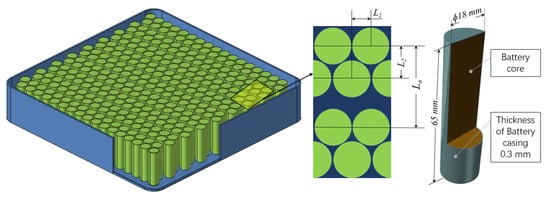 As shown in Figure 2, the 18,650 battery has a cross-section diameter of 18 mm and a height of 65 mm, and its internal structure can be divided into two parts: the battery core and the steel battery casing with a thickness of 0.3 mm. The model construction needs to take into account the arrangement of inter-cell cooling tubes under actual working conditions. The battery cells are arranged in the battery case in a group of two columns in parallel, with the two columns of single cells in the group staggered. The transverse distance L1 and longitudinal distance L2 between neighboring cells in different columns in the group are 9 mm and 16 mm, respectively, and the spacing La between groups is 38 mm and parallel.