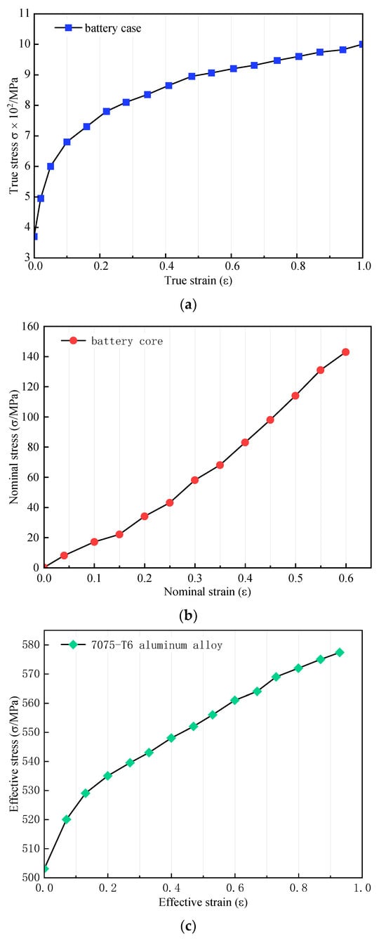 Stress–strain curves of model materials: (a) battery casing stress–strain curve; (b) battery core stress–strain curve; (c) 7075-T6 aluminum alloy stress–strain curve.