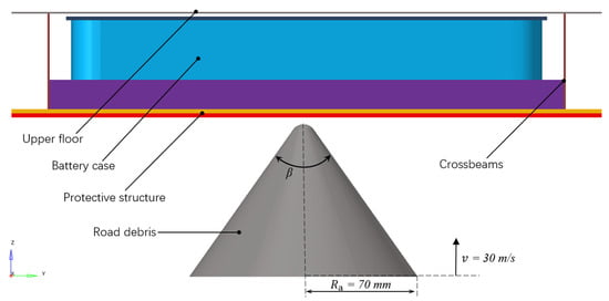 The model prototype was drawn using CATIA P3 V5R21 software and imported into Hypermesh 2022 software for pre-processing. The LS-DYNA_SMP_R13 mode was selected in the Hypermesh 2022 software to establish the impact-resistant finite element model of the battery case system. As shown in Figure 4, the degrees of freedom at the edges of the floor and protective structure were entirely restricted to simulate the system’s constraint by the body structure. A weld constraint connection is required at the connection of the cross member to the floor and protective structure, constraining the internal battery case. The obstacle acts on the bottom center of the system: the radius of the bottom surface of the conical head Ra was 70 mm, the cone angle β was 60°, the initial velocity of the impact was set to 30 m/s, and the direction was vertical up. According to the “Requirements and Test Methods for Bottom Crashworthiness of Pure Electric Passenger Vehicles” issued by the Chinese Society of Automotive Engineering, the impact energy endured by the bottom of the vehicle should be within the range of 120 ± 3 J. The collision energy was adjusted by changing the density of the obstacle, and the initial kinetic energy was limited to the range of the test requirements.