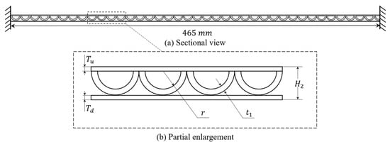 As shown in Figure 6, the arch structure adopts a semicircular structure with similar morphology to a square circle between two aluminum alloy plates with a thickness of Tu = Td = 1.5 mm. The thickness of the sandwich structure is the inner circular radius of the arch structure, the thickness of the arch structure, the thickness of the upper and lower two layers of aluminum alloy plates, and the sum of the thickness of the arch structure. For a semicircular arch structure as a standard unit, set the number of standard units contained in the cross-section of the arch structure be n2, the arch structure of the inner circular radius to r, and the thickness of t1, the height of the arch sandwich structure to H2. There is a relationship between these terms, as shown in the following formula: