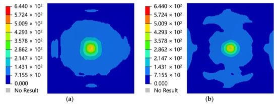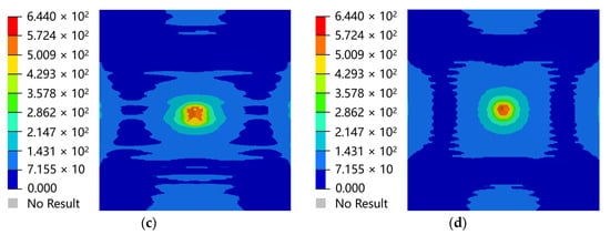 Figure 9 shows the stress distribution on the protective structure when the kinetic energy of the road debris is fully applied to the model, with different stress distributions occurring on different structures. Figure 9a shows the stress distribution during a collision for the 6.35 mm homogeneous protective structure, on which the stress disperses outward from the collision point, and the energy in the center of the collision is concentrated and has a wide range of influence. Figure 9b shows the collision stress distribution during a collision for the double-layer structure. Although the total thickness of the double-layer structure is greater than that of the homogeneous structure, there is no connection between the two neighboring protective structures in the structure, which affects the overall structural strength. This results in more significant plastic deformation of the double-layer structure during a collision, and the stress distribution is more irregular and easy to transfer to a deeper layer. Figure 9c shows the stress distribution during a collision for the arched sandwich construction, where the collision stress is transferred along the protective structure and the internal arch structure, with the center of the collision absorbing more stress due to structural deformation. Figure 9d shows the collision stress distribution during a collision for the reinforced hexagonal honeycomb sandwich structure. Under equal mass conditions, the structure density of the reinforced hexagonal honeycomb sandwich structure is higher than that of the arched sandwich structure, and the stresses it suffers are diffused along the structure in a square shape. Because its structural strength is less than that of the arched sandwich structure, the center of impact is more likely to deform, resulting in a greater risk of puncture.