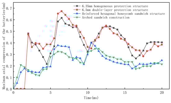 The change curves of the axial compression of the battery corresponding to the homogeneous structure and the three protective structures with the collision time are shown in Figure 10. Figure 10 shows that the sandwich structure can effectively attenuate the degree of deformation of the power battery in the collision process. From the curves in the figure, it can be seen that the deformation trends of the batteries protected by the double-layer structure and the homogeneous structure are approximate. Both of them are subjected to the second impact because of the plastic strain of the protective structure after reaching the first peak, and then they gradually tend to be stabilized with the consumption of energy. Compared with the homogeneous and double-layer structures, the deformation curves of the power battery corresponding to the two sandwich structures are gentler. The deformation peaks occur earlier and stabilize faster due to the deformation of the core layer of the sandwich structure and energy absorption. The maximum deformation of the power battery under the protection of the arch sandwich structure is minor, which proves that the arch sandwich structure has a better protective effect on the power battery located in the upper layer in the case of bottom collision.