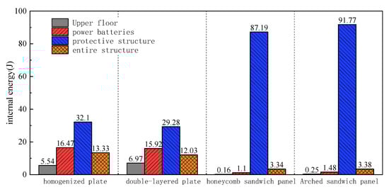 The four protective structures were chosen to be compared with the other parts in terms of energy absorption when the impactor’s kinetic energy is fully applied to the battery case model, as shown in Figure 11. The arched sandwich structure has the highest energy absorption value, indicating the best energy absorption. The reinforced hexagonal honeycomb sandwich structure has a slightly lower energy absorption value than the arched sandwich structure, but the other structures of the same model absorbed the least amount of energy, proving that its multilayer structure is more effective in cushioning; the 6.5 mm double-layer structure is weaker than the 6.35 mm homogeneous structure, which proves that purely increasing the number of layers will destroy the structural stability of the protective structure, which is not conducive to the protection of the protective structure located above the battery box.