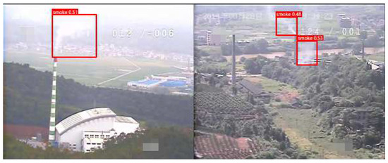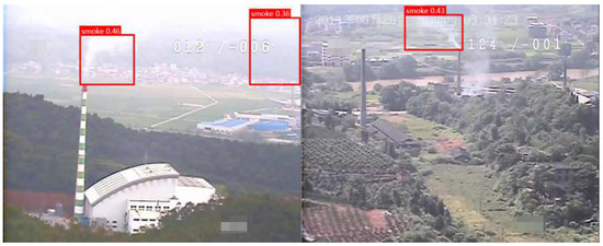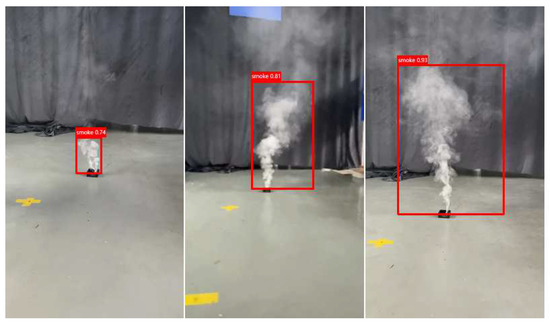 For the feasibility validation of deploying the improved YOLOv5 model, this study employed simulated experiments. In the first stage, smoke targets were simulated using burning smoke cakes. As shown in Figure 13, early-stage fire smoke targets were relatively small, but the improved YOLOv5 was still able to detect them.