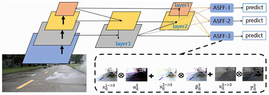 The main objective of the ASFF module is to address the issue of feature fusion from different scales in object detection tasks. During smoke detection, the distribution and scale of smoke may vary due to the complexity of the environment. Therefore, an effective method is needed to integrate features of various scales to enhance detection performance. The ASFF module dynamically adjusts the contribution of feature maps by introducing adaptive weights, thereby better capturing information from smoke targets.