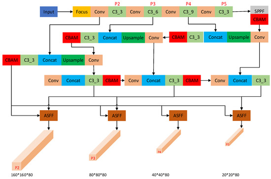 YOLOv5 stands as a cornerstone model in object detection, boasting three detection heads, each tailored to process specific scales of images. For instance, when presented with a 640 × 640 input image, the downsampling operation generates feature maps of sizes 80 × 80, 40 × 40, and 20 × 20, respectively. As a general principle, with increased downsampling, the receptive field expands, yet the challenge of detecting small objects concurrently escalates. The default detection head of YOLOv5 follows a conventional design, comprising a sequence of convolutional and pooling layers aimed at extracting target position and class information from the feature maps. Although this default detection head showcases commendable performance across most scenarios, it falls short in terms of a sufficiently expansive receptive field to effectively manage small objects or intricate backgrounds. Here, the term “receptive field” denotes the portion of the input image visible to a node within the neural network. In the context of small objects, inadequate receptive field coverage within the detection head translates to an inability to capture requisite contextual information, thereby resulting in misidentification or complete oversight of the target. Consequently, this paper advocates for the integration of larger detection heads, as illustrated in Figure 6.