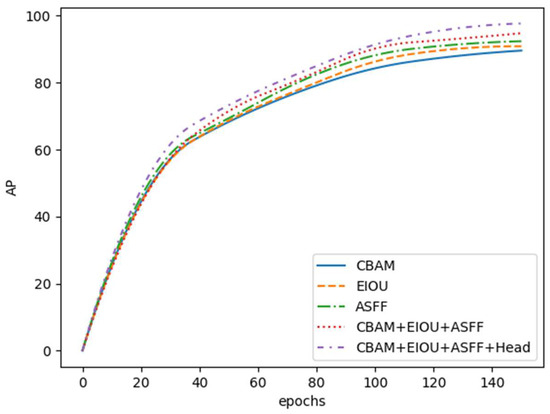 From the data results in Table 2, it is evident that the introduction of different modules in this study has substantially impacted the performance of the YOLOv5 model in detecting small smoke targets. Firstly, when the CBAM and EIOU modules were introduced individually, there was almost no substantial decrease in FPS, but a substantial improvement in accuracy was achieved. This indicates that the CBAM and EIOU modules can enhance the smoke detection accuracy of the model without compromising real-time performance. The convergence curves of each model are shown in Figure 8.