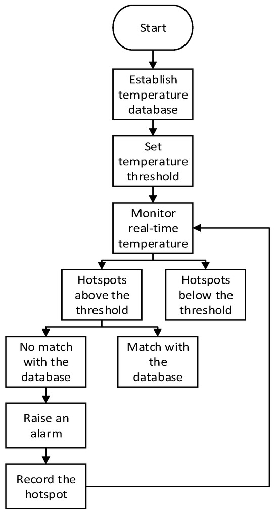 The threshold-based hotspot detection algorithm is a simple and intuitive method suitable for quickly detecting temperature anomalies. Its flowchart is shown in Figure 11.