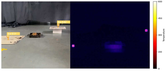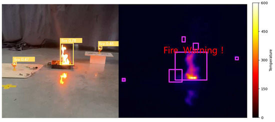 In the second phase, the propagation of flames was emulated using tobacco drenched in liquid fuel. As illustrated in Figure 14, despite the initial fire source being modest, it exhibited pronounced visibility in the thermal imagery captured by the thermal surveillance camera. The left-side target box in the image signifies the flame recognized by the enhanced YOLOv5, while the target box on the right side of the heatmap indicates the aberrant hot spot identified by the temperature-based threshold detection algorithm introduced in this study. As delineated in Figure 15, with the gradual expansion of the fire, the ultimate algorithmic model devised in this investigation demonstrated exceptional performance in both target discernment and flame characteristic extraction.