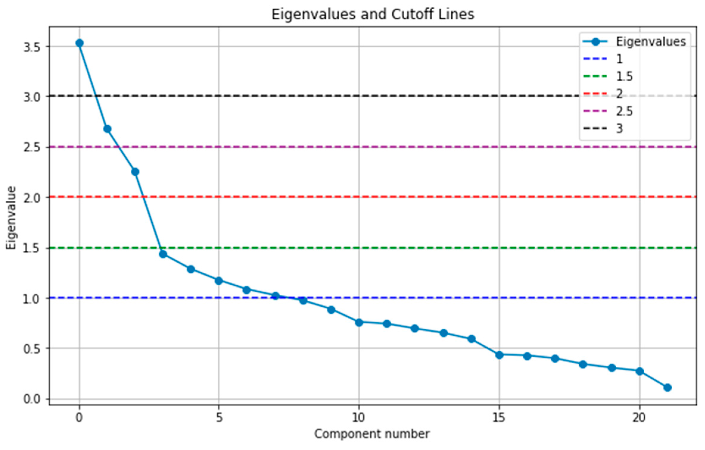 The figure illustrates the impact of various eigenvalue cutoffs on the percentage of cumulative explained variance retained in the PCA results. When retaining components with eigenvalues greater than one, eight components would be retained and approximately 85.54% of the cumulative explained variance is preserved. This suggests that a substantial portion of the dataset’s variability is captured, supporting the robustness of the analyses derived from these components. In contrast, higher cutoffs of 1.5 and 2 retain significantly less variance, at 38.33% each, indicating a steep drop in the variance explained by the retained components. As the cutoff increases to 2.5 and 3, the explained variance further decreases to 28.10% and 15.97%, respectively.