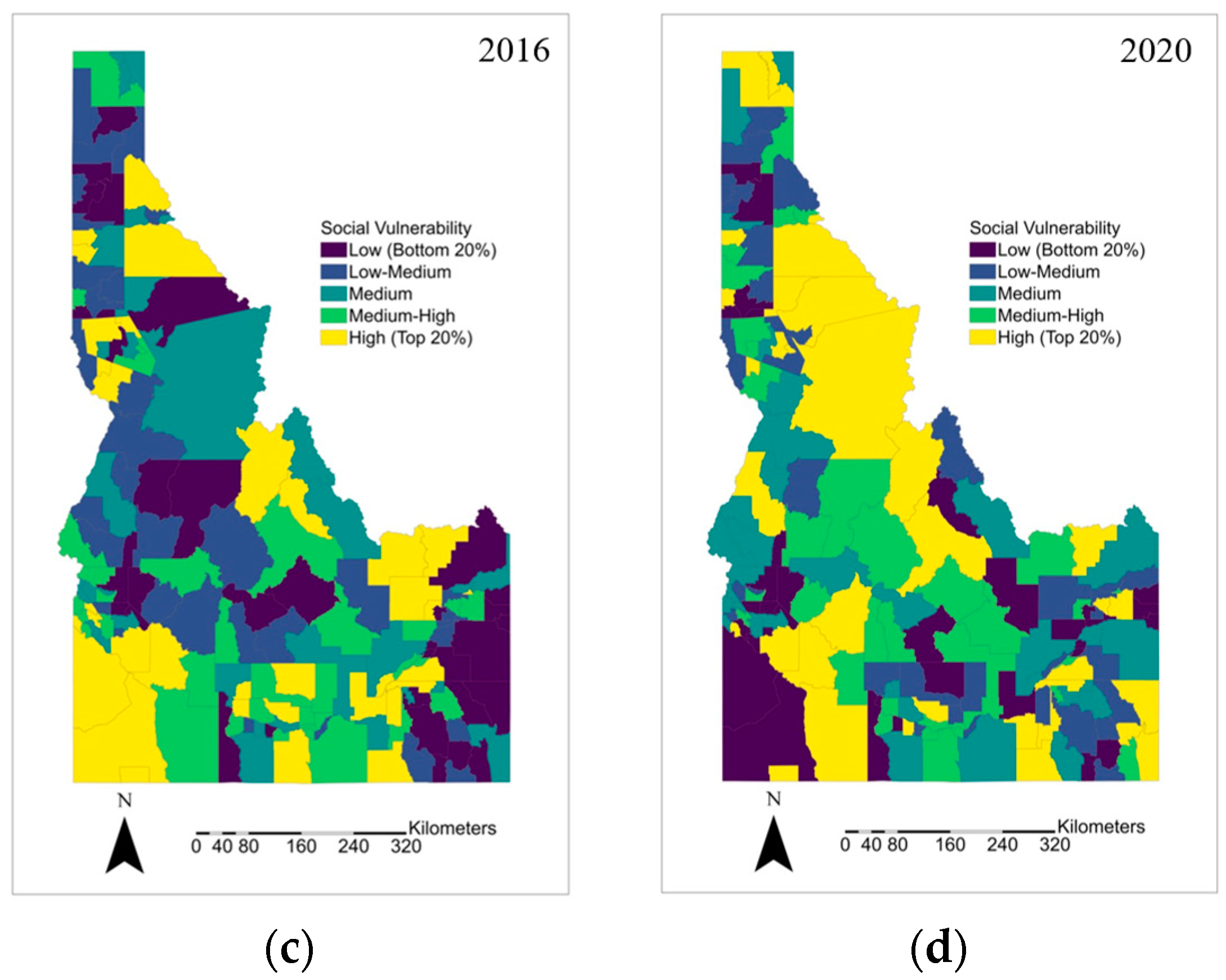 We plotted the 2011, 2016, and 2020 maps of Idaho to show the main change in the social vulnerability. The sequential maps of social vulnerability (