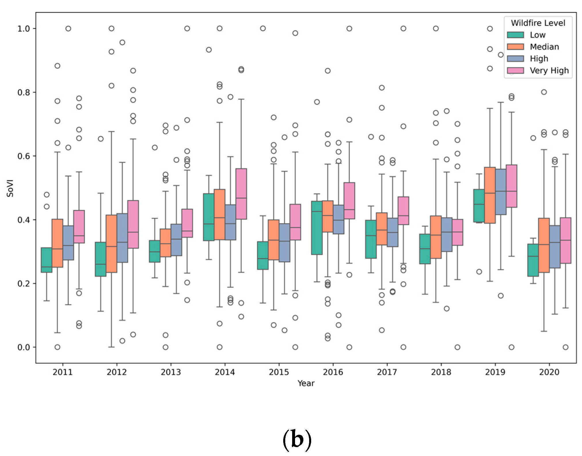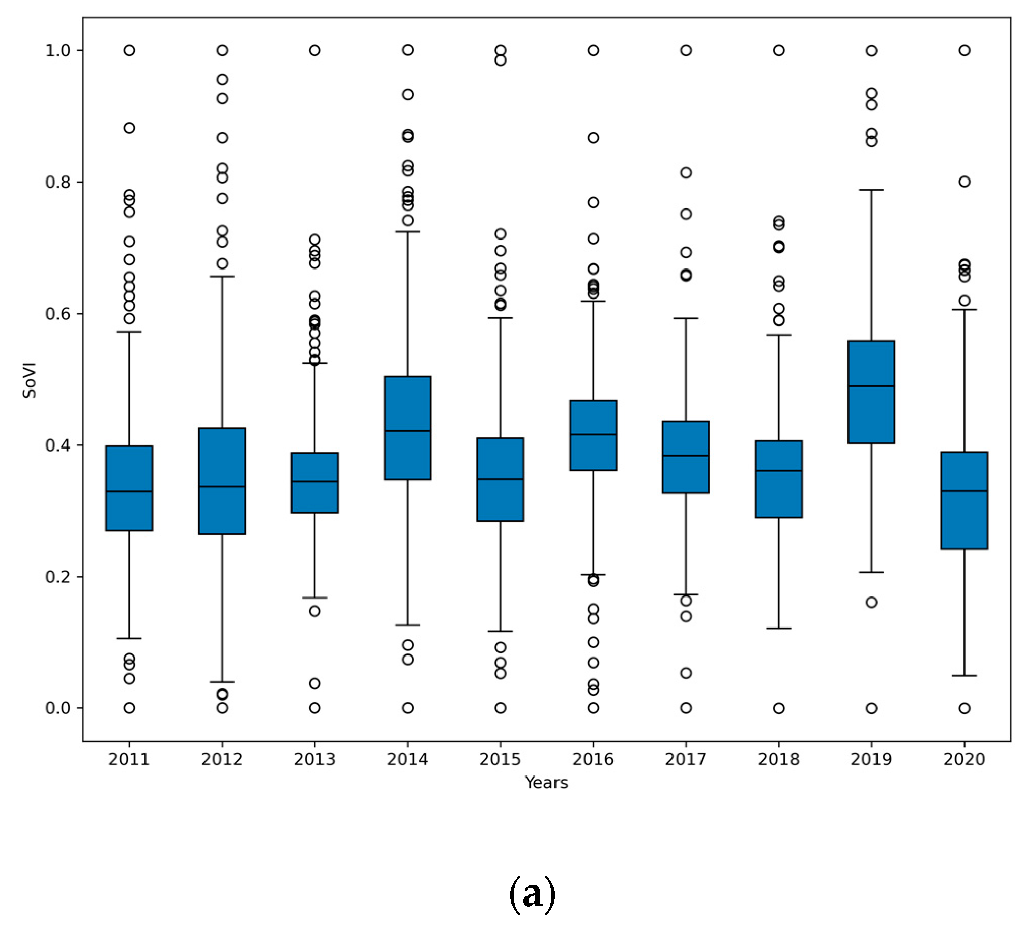 Figure 5a, there are 222 subdivisions in each box. And there are a number of outliers in each box plot. This is because of the data processing methods as the use of min–max scaling and PCA for dimension reduction will enhance the visibility of outliers in the dataset. While these techniques help in normalizing the data and reducing dimensionality for better analysis, they can also lead to pronounced differences when extreme values are present. The median value of SoVI in Idaho does not change a lot during 2011 and 2012 since there is no wildfire that happened during this period. However, the SoVI started to increase from 2012, as shown in the red solid line. This is because a big wildfire happened in 2012 which could damage the infrastructures and transportation in society leading to an increase in social vulnerability. There are no long-term trends present in