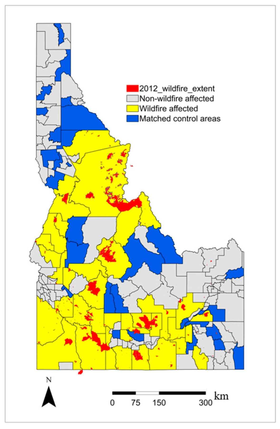 Table 2 presents the results of PSM and highlights significant baseline differences between matched wildfire-affected and non-wildfire-affected areas. The locations of matched and control areas in the study area are displayed in