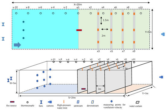 The experimental platform for a 1:1 tunnel was established, measuring 20 m in length, 5 m in width, and 5 m in height. To accurately monitor the temperature distribution within the tunnel, eleven thermocouples were strategically positioned along its horizontal axis. These thermocouples were labeled as x-2, x-4, x-6, x-8, and x-10 in the upstream direction from the center position of the tunnel (x0), and as x2, x4, x6, x8, and x10 in the downstream direction. The values represent the distance from the center point of the fire source in meters. The thermocouple is installed in the upper left corner of the tunnel ceiling, 0.05 m away from the ceiling. To mitigate the impact of water on probes and minimize interference with temperature measurements, waterproof protection was implemented for all thermocouples in this experiment. The thermocouples were arranged within the channel to measure the temperature field of the tunnel fire, thereby capturing the initiation, progression, and propagation stages of fire development. The thermocouples with a diameter of 1 mm was employed to measure temperature, covering a temperature range of −50 to +800 °C. The fire source location was set at x0, and a set of fans was arranged at one end of the tunnel to investigate the variations in data during mechanical exhaust. Downstream of the tunnel, a camera was installed to document the progression of the fire. The experimental platform and test point layout are shown in Figure 1. In order to protect the tunnel structure in the experiment, rock wool board was installed on the tunnel wall for fire prevention. The characteristic parameters of rock wool board are shown in Table 1.
