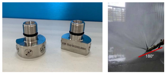The pressure range of the high-pressure water mist system spanned from 0 to 12 MPa, with a motor power of 37 KW and a maximum flow rate of 150 L/min. In this experiment, the nozzle spray pressure was set at three levels: namely, 6 MPa, 8 MPa, and 10 MPa. The nozzle specification model was XSWT, and the nozzle flow coefficient was 0.5. The nozzle has 4 holes, each with a diameter of 1 mm. The spray droplet diameter . By using the flow calculation formula [18], the flow rates of a single nozzle at pressures of 6 MPa, 8 MPa, and 10 MPa were determined to be 3.87 L/min, 4.47 L/min, and 5 L/min, respectively. Upon activation of the nozzle, a semi-circular water mist area will be sprayed out, as shown in Figure 2. Notably, the atomization cone angle of the nozzle is greater than 180°.