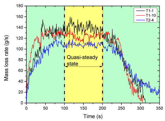 The heat release rate (HRR) test of the fire source was conducted using a 2 m × 2 m square oil pan for a duration of 300 s. A total of 30 kg of n-hexane was used in each experiment. Table 2 shows a summary of the experimental conditions. The T1 series indicates no mechanical ventilation, while the T2 series indicates that mechanical ventilation is enabled. Figure 3 shows the mass loss curve for T1-1, T1-10, and T2-4.