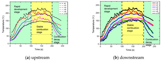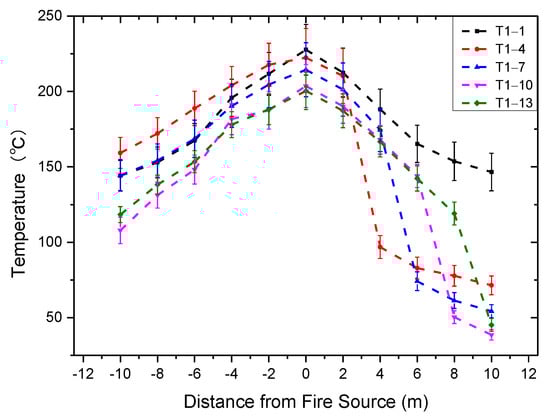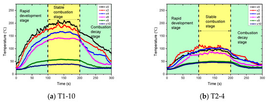 As shown in Figure 5, the highest temperature (exceeding 230 °C) is concentrated at the central point of the fire source (x0). As one moves away from this origin in either direction, a gradual decrease in temperature can be observed. The temperature curves at x2 and x-2 exhibit similar characteristics, reaching a maximum temperature of about 215 °C. Similarly, the maximum temperature at x4 and x-4 is about 195 °C; it drops to about 165 °C at x6 and x-6; it further decreases to approximately 155 °C at x8 and x-8. Finally, the maximum recorded temperature stabilizes at around 150 °C at positions x10 and x-10. This observation suggests that, in the absence of any control measures, smoke disperses towards the ceiling and subsequently spreads to both ends. To further investigate the characteristics of the temperature field distribution in the tunnel without mechanical smoke extraction and water curtain systems, we compare the average temperature during the stable phase of fire combustion. Specifically, the average temperatures between 100 s and 200 s after the flame burns are considered, namely, the “quasi-steady-state period”.
