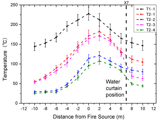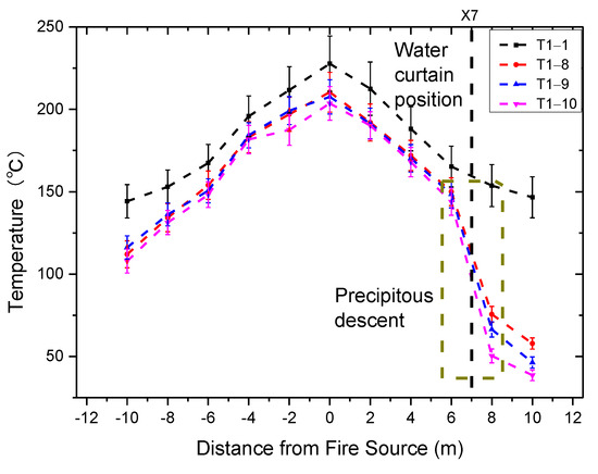 Experiments T1-4, T1-7, T1-10, and T1-13 were conducted to investigate the effect of different nozzle positions on the performance of the water mist segment system. In these experiments, the nozzle positions were set at x3, x5, x7, and x9, with a nozzle pressure of 10 MPa. Figure 7 shows the average temperature distribution from the ceiling position of the tunnel at the stable combustion stage of the fire source in experiments T1-4, T1-7, T1-10, and T1-13. It can be observed that the temperature exhibits a significant and abrupt decline resembling a “cliff-like” drop, both before and after the activation of the water curtain system at various nozzle positions, with an approximate temperature difference of 100 °C. The vertical error bars for this set of the data indicate the range of levels in the three tests, and the error was not more than 9.1%.