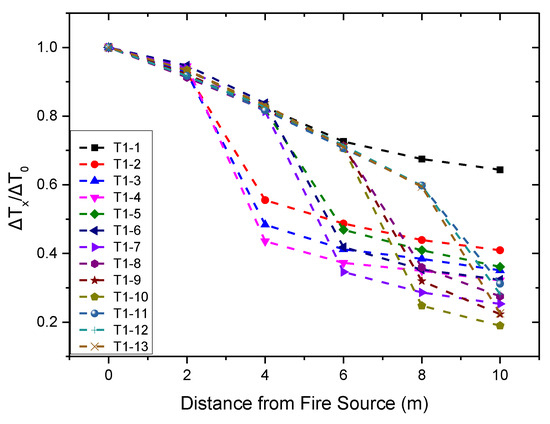 The attenuation law of the temperature field on the downstream ceiling of a tunnel fire under natural ventilation conditions is firstly analyzed, followed by dimensional reduction of the temperature field [32]. Figure 8 shows the results of the non-dimensionalization process of the longitudinal temperature field attenuation of a fire. In this figure, ΔTx represents the average temperature rise at a distance x from the fire source, and ΔT0 represents the average temperature rise of the thermocouple directly above the fire source at x0. It can be seen that under various experimental conditions, the dimensionless temperature experiences varying degrees of attenuation when smoke passes through a high-pressure water curtain. Notably, there is a significant decrease in the dimensionless temperature on the protected side. However, the characteristics of dimensionless temperature gradient attenuation remain unclear for different nozzle positions and water curtain pressures.