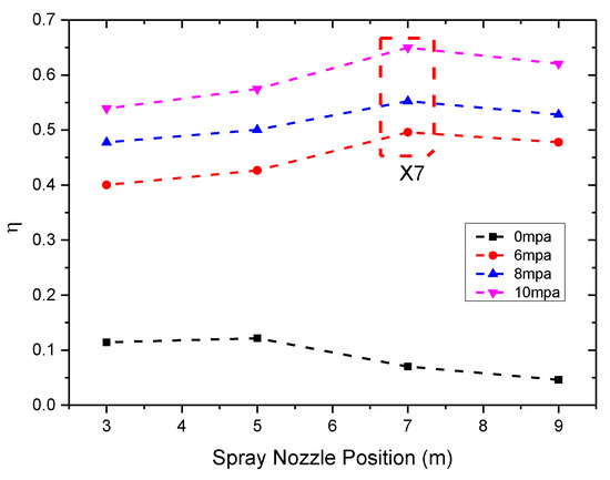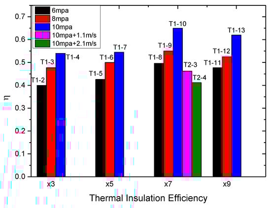 Figure 9 shows the thermal insulation efficiency of high-pressure water mist. As depicted in the figure, the high-pressure water mist system exhibits a significantly elevated thermal insulation efficiency. In order to analyze the insulation efficiency of air, referring to Equation (4), the thermal insulation efficiency of the air is around 0.1. Upon activation of the high-pressure water mist system, the thermal insulation efficiency surpasses 0.4, and an increase in the working pressure of the nozzle further increases the thermal insulation efficiency. The reason for this phenomenon is that, as the nozzle pressure increases, the water spray flow per unit time increases, which improves the thermal insulation efficiency [33]. Simultaneously, it is evident that, as the nozzle position moves away from the fire point, there is an increase in thermal insulation efficiency. Taking a water pressure of 10 mpa as an example, when the nozzle positions are x3, x5, and x7, the thermal insulation efficiencies are measured at 0.54, 0.57, and 0.65, respectively. The comparison results show that there is a superior thermal insulation efficiency in experiment T1-10. However, once the water curtain position surpasses x7, a decline in thermal insulation efficiency can be observed.