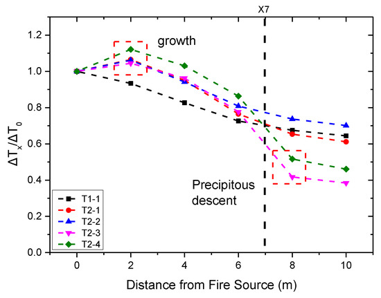 The attenuation law of the temperature field on the ceiling downstream of the tunnel fire is analyzed under conditions of mechanical smoke extraction, and a dimensional reduction approach is applied to characterize the temperature field. Figure 13 shows the dimensionless treatment results of the longitudinal temperature field attenuation during a fire. In this figure, ΔTx represents the average temperature rise at a distance x from the fire source, while ΔT0 represents the average temperature rise of the thermocouple directly above the fire source at x0. It can be observed that, when mechanical smoke extraction is used in the tunnel, the longitudinal fire temperature field exhibits an initial increase followed by a subsequent decay, with the maximum dimensionless temperature occurring near x2. When high-pressure water mist is set at x7, there is a significant attenuation of the dimensionless temperature in experiments T2-3 and T2-4 at this location.