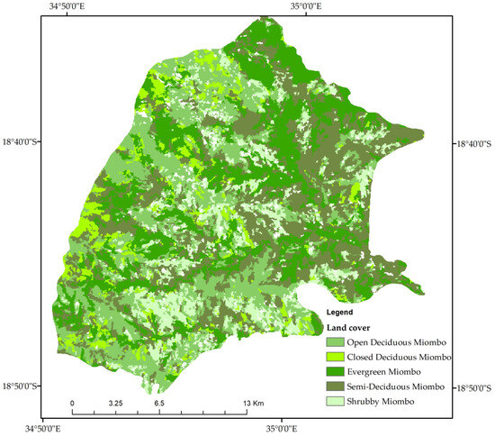 A validated land cover (LC) map was freely accessed through a geospatial database released by the Monitoring Report and Verification (MRV) department under the National Fund for Sustainable Development of Mozambique website (Figure 2). A description of this map can be found in FNDS [39]. The LC map was used to understand fire dynamics in the region, as vegetation is a key factor for fire occurrence analysis [19,20,21]. The LC names adopted in this manuscript are modifications of the LC names on the original map from the website. We performed these modifications based on the training data collected during the fieldwork. This allowed us to match the names from the map with the corresponding Miombo woodland types according to our field observations. We overlaid the national land cover map with the LFC boundary shapefile to identify LC types using remote sensing techniques [40]. Accordingly, seven cover types were identified: Open Deciduous Miombo (ODM), Close Deciduous Miombo (CDM), Semi Deciduous Miombo (SDM), Evergreen Miombo with Riverine forest (EGM), Grassland, Shrubby Miombo (SM), and Temporary Flooded Grassland (TFG). For this study, we only considered ODM, CDM, SDM, EGM and SM because these are the Miombo types encountered in the region. We excluded TFG and Grassland because the focus of our study is on Miombo.