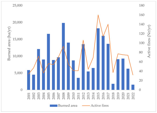 Inter-annual variation of burned area and active fires from 2001 to 2022 in the LevasFlor Forest Concession, Central Mozambique.
