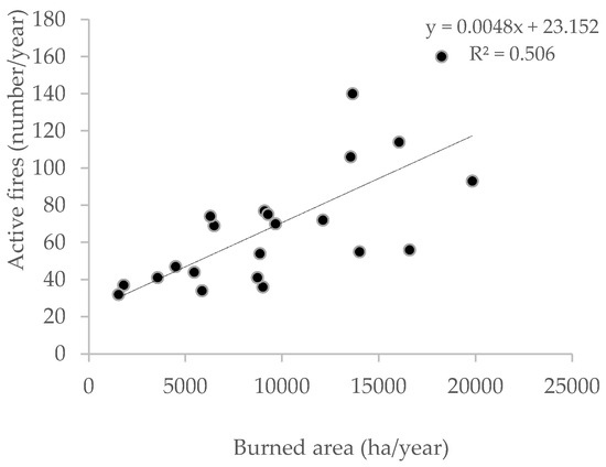 There was also a significant convergence between the distribution of the burned areas and clusters of active fires, indicating a positive and statistically significant correlation between these two variables (R2 = 0.51, p < 0.00001; Figure 5).