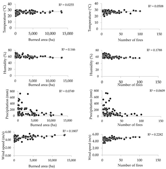 We investigated the relationship between climate data (precipitation, temperature, relative humidity, wind speed) and fire incidences (monthly burned area and active fires) using simple regression, as earlier studies indicate climate data as one of the main factors influencing fire dynamic [20,34,43]. This assessment helped us understanding how climate might explain the monthly variation of BA and AF in the LFC. Thus, we considered the dependent variables, the monthly BA and the monthly AF, while the climate data were considered the independent variables. The coefficient of determination (R2), residual distribution, and standard error were calculated to determine how well each independent variable could explain the variation of the dependent variables at a 95% confidence level.