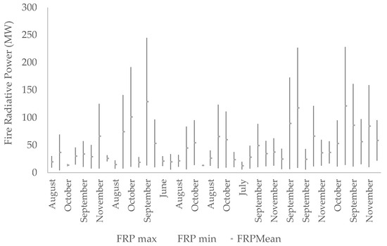 Active fires with an 80% confidence level were used to extract the fire radiative power (FRP). This variable has a linear relationship with fire intensity [38,41,42]. This is because FRP is mathematically calculated as the ratio between the brightness temperature of the fire and the background temperature of the pixel in the mid-infrared region, as described in Equation (3) [30,42,43]. Therefore, FRP was used to quantify the intensity of radiant heat detected by the MODIS products [18,34]. We calculated the mean FRP for each month in each year assessed and then extracted the data for further analysis. FRP is computed as follows [30,34].