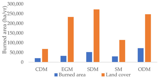 The land cover type also plays a significant role in fire incidence in the LFC. Results illustrated in Figure 10 demonstrated that fires mostly affected the deciduous and relative open Miombo types, such as ODM, SDM and SM, while CDM and EGM were less affected by fires. According to Cangela [23], the unique combination of grass and tree structures in this Miombo category creates an appropriate environment for the ignition and spread of intense fires. The CDM and the EGM showed the least burned area over the 21 years assessed, as the moisture levels in closed forests are high and oxygen levels are low, which limits the spread of fires. However, some fires in impenetrable EGM canopy may not be detected by satellite imagery, as these fires are often superficial [26]. Also, it acknowledges that MODIS pixels’ spatial resolution might exclude small fires, this may be a reason to recommend further studies to apply remote sensing data (e.g., Sentinel mid-resolution images) that can detect small fires [49,50]. In contrast, although closed and evergreen Miombo had significant potential for fires in terms of fuel load, the spread of fires was limited due to moisture content in the fuel material, a high percentage of relative humidity, less wind speed, and lower temperature, as described by Archibald et al. [20], Kumar and Kumar [43], and Nieman et al. [34].