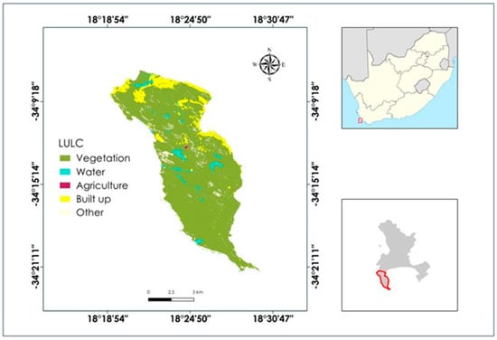 The study area covers approximately 475 km2 and is located in the southwestern region of South Africa []. It is predominantly covered by fire-prone fynbos shrubs. Figure 1 displays a land-cover map depicting part of the Cape Peninsula. The Cape Peninsula experiences a Mediterranean climate characterized by warm, dry summers and cool, rainy winters. Winter precipitation is brought by frontal cyclones originating from circumpolar westerly winds, occurring typically once a week during the mid-winter months from June to August []. In summer, the climate is influenced by the South Atlantic High-Pressure Cell, resulting in southeasterly winds along the west coast. Anthropogenic climate change has altered weather patterns in this area, leading to increased conditions favourable for fires [].