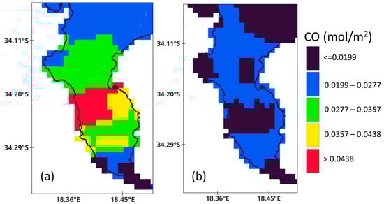 CO distribution over the Cape Peninsula on (a) 12–15 December 2023 and (b) 22–25 December 2023.