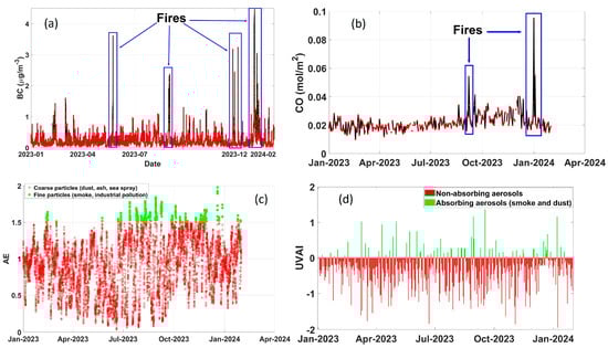 Time-series for the Cape peninsula region for the period of January 2023 to January 2024 for (a) BC, (b) CO, (c) AE and (d) UVAI.