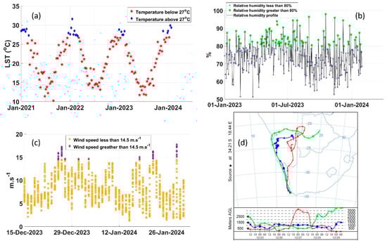 Time-series of (a) LST, (b) relative humidity and (c) wind speed over the Cape Peninsula. (d) 120 h-forward trajectory from 25–29 December 2023.